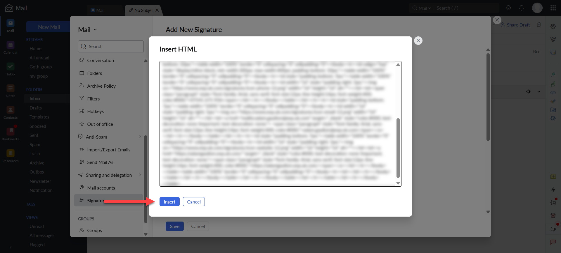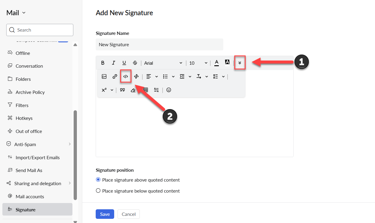 If you are using a html signature, click on the drop menu to the far right of the editing toolbar/ribbon to reveal additional tools. Here you'll find the option to enter HTML code for signature where that's required. Just click the HTML button, paste your code to the box and click insert to save it.
