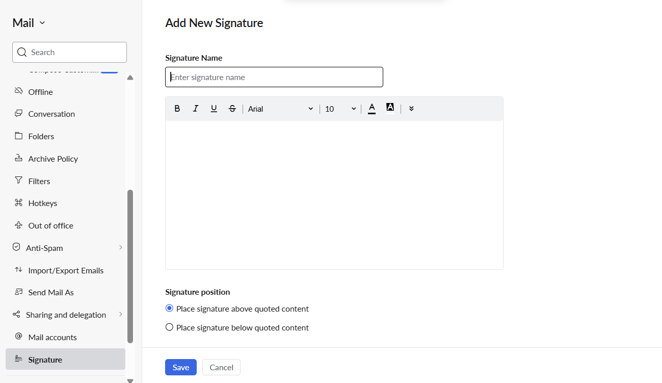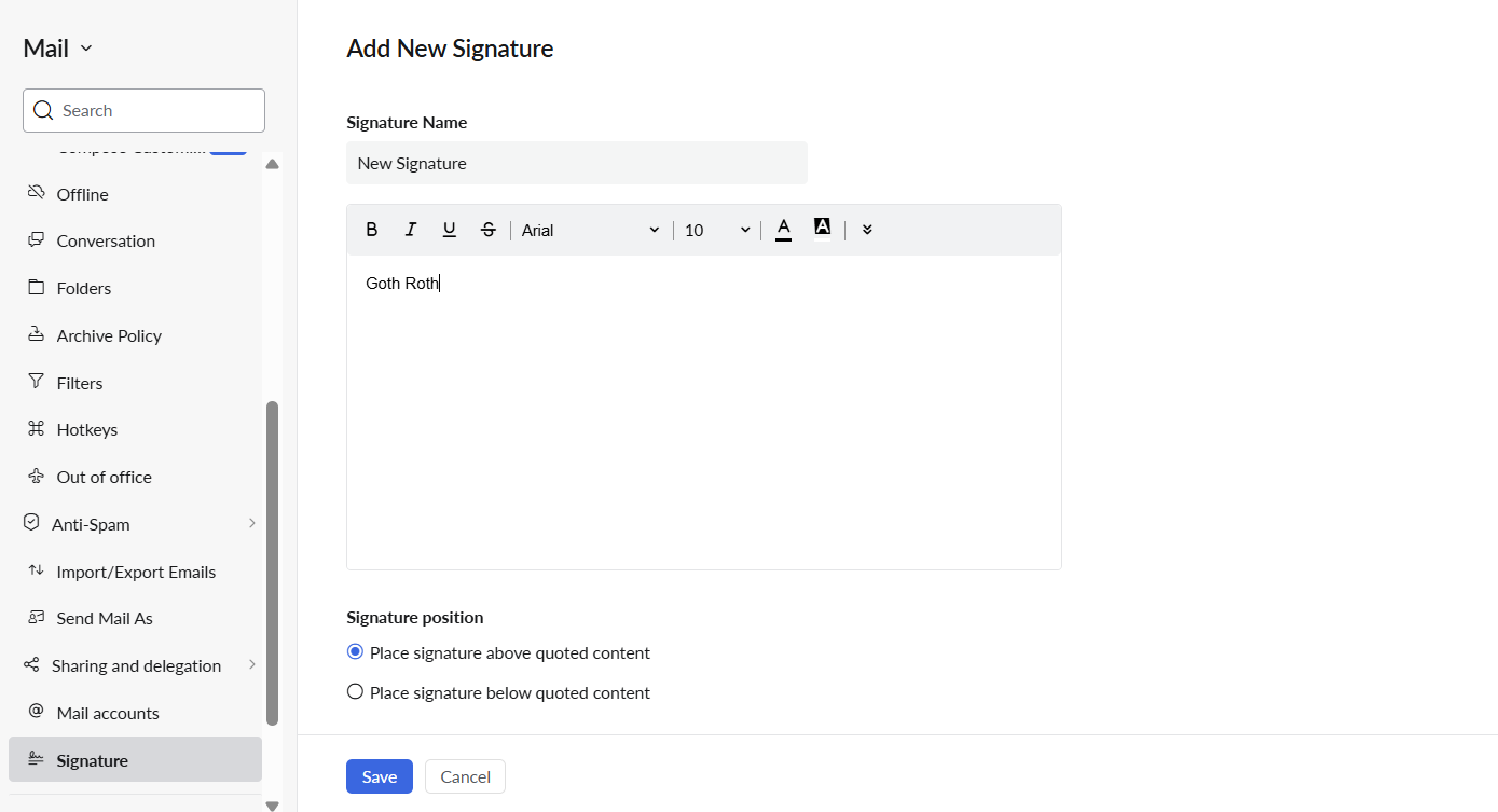 After you've opened the settings menu, scroll down on the left sidebar until you find 'signature' in the list. Click it to open the signature submenu. Here you can assign a name for the signature you are creating and use the proivded toolbar in the main box to edit to you liking.