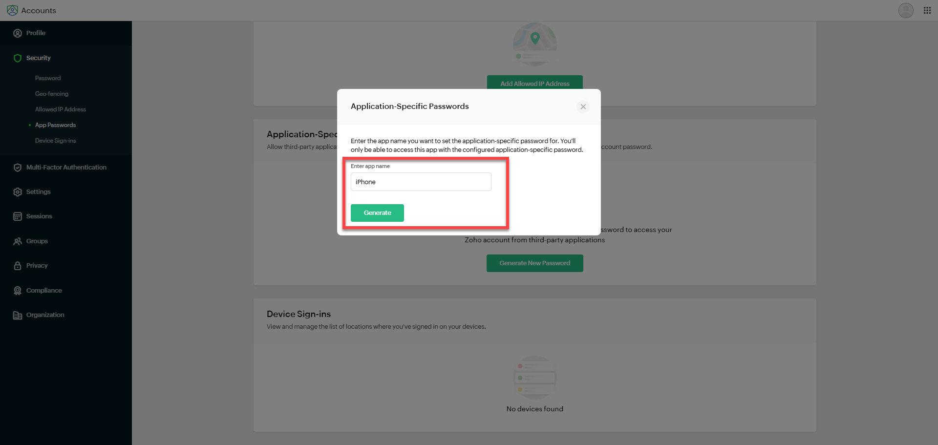 3. Once you've accessed your zoho account configuration page, click Security in the left sidebar to open the submenu and then click App Password below. You'll see the Application-Specific Passwords box to the right. Click the Generate New Password button to begin creation of a new app specific password.