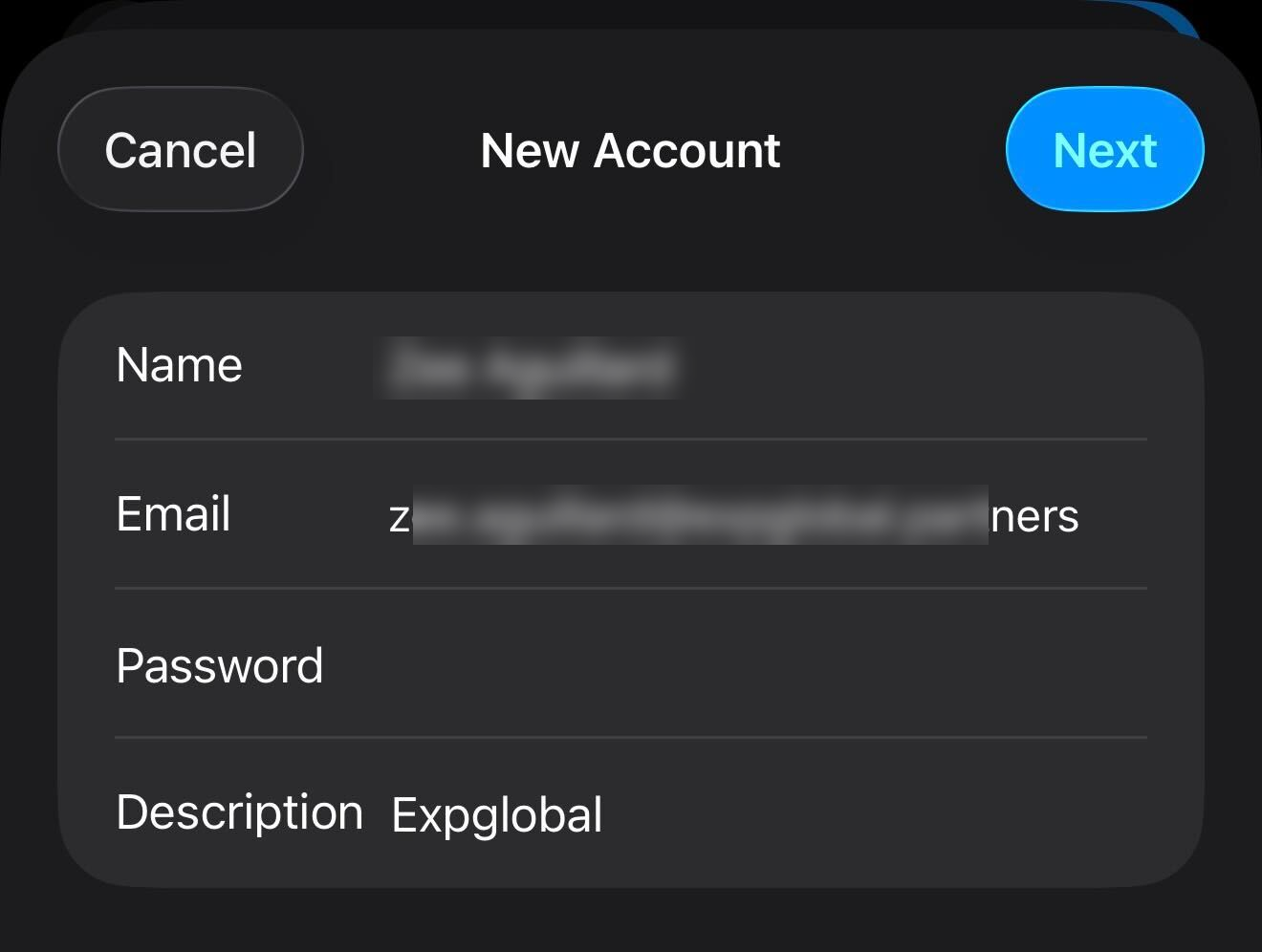 6. On the following screen you'll be asked to fill in your name, email address, password and a description of the email account so you can distinguish it from other accounts. Once you've entered this information your can tap next in the top right corner to proceed to the next step.