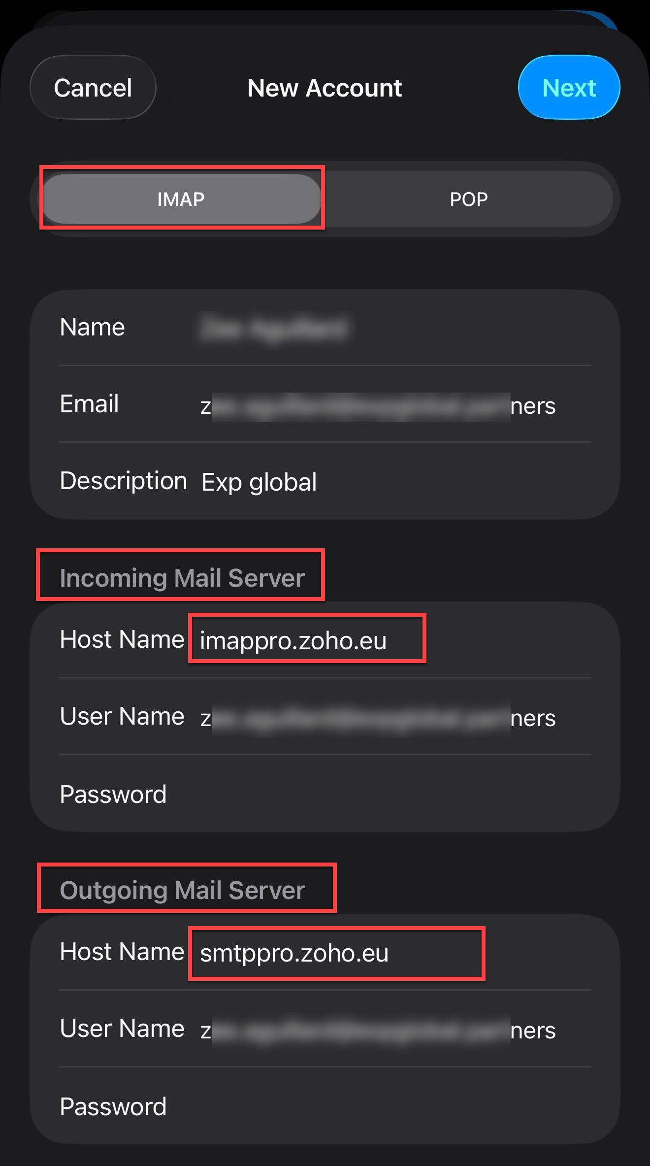 IMAP Incoming server: imappro.zoho.eu
