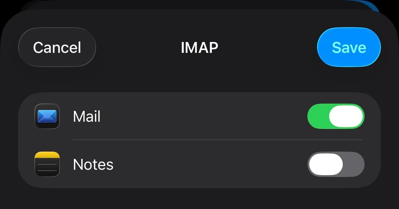 8. After the verification process is completed you'll be taken to the screen where you can toggle on/off Mail and Notes for syncing. Unfortunately Zoho Mail does not support notes syncing so the recommendation would be to toggle notes sync off. Once you have Mail toggled on and Notes toggled off, tap save in the top right corner.