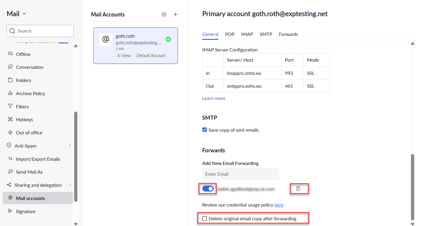 After confiming your forwarding address you'll see that it's no longer grayed out and you have the ability to toggle forwarding off/on for the added address as well as remove the address completely by clicking the trashcan to the right of the address. Further down you'll also notice that you have the option to "delete original email copies after forwarding." If you don't intend to log into your eXp Mail using the Zoho Mail user interface to manage your inbox, it's recommended that you select this option to prevent your inbox strorage from filling completely, potentially causing missed, late or lost emails.