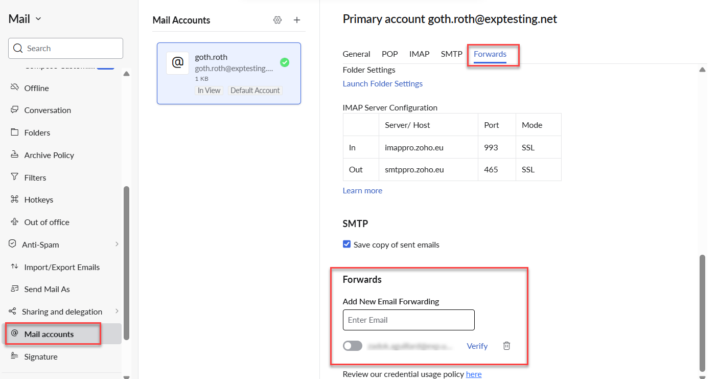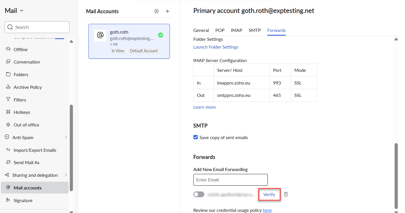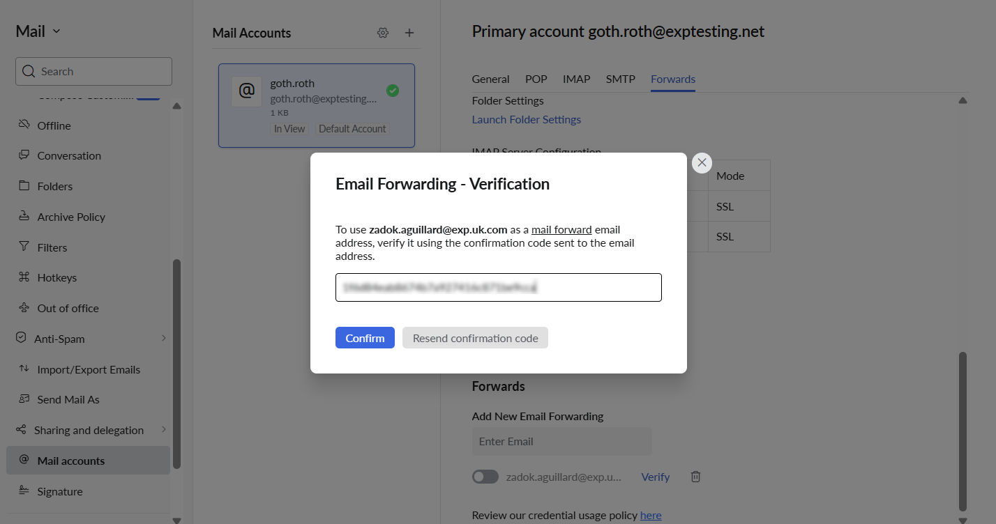 Copy the code and then return Zoho Mail and click verify next to the chosen forwarding email address in the configuration menu.