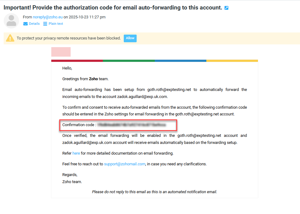 To verify your selected forwarding email address you'll need to open the confirmation email sent to it. Within that email you'll find a verification code needed to complete the process. It'll look similar to what is shown below.
