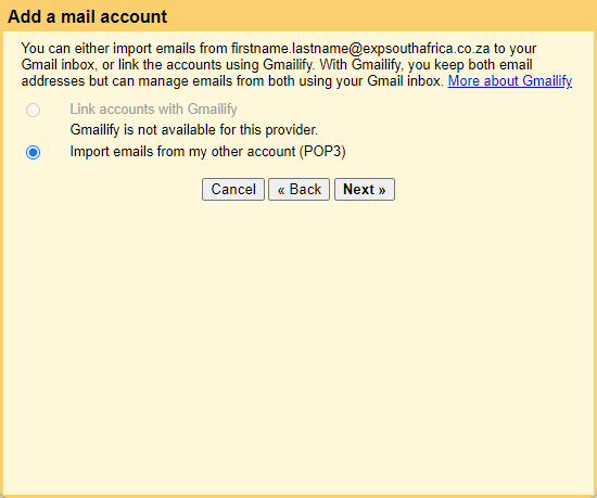 3. Nella schermata seguente lascerai l'impostazione predefinita per Importa email dall'altro mio account (POP3) selezionato e quindi fare clic su Avanti.