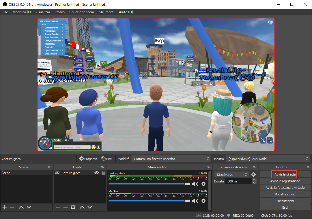 Una volta completata la configurazione di OBS, sarai in grado di registrare o trasmettere in streaming una lezione o una riunione all'interno di eXp World. Dalla finestra principale dell'applicazione, fai clic su Avvia streaming.