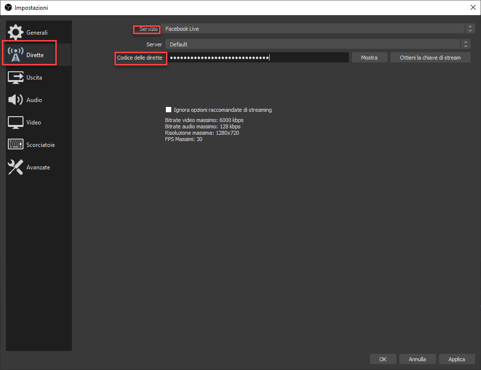 2. Modifica l'del servizio impostazionesu Facebook Live e inserisci la chiave Stream.