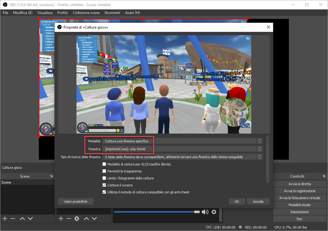 1. Dovrebbe essere caricata una nuova finestra. Modificare l' Modalità impostazionein Cattura finestra specifica e modificare l' Finestra impostazionein eXp World e faresu clic OK.