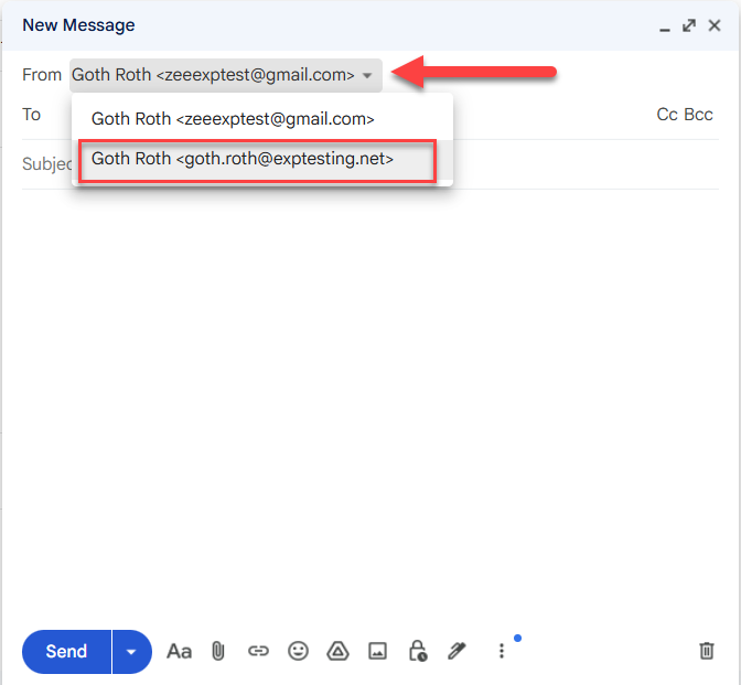 1. Now that you've got Send As set up for use with your eXp email address in your Gmail account, all you have to do is click compose to start writing a new email as normal. Next, click on the from field in the compose box and select your eXp email address to send email with that address. Compose your email and click Send. You can go to your sent folder to verify that Gmail has sent your email.
