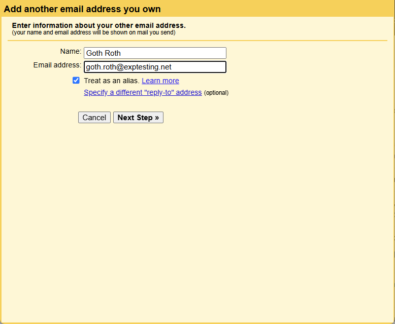 3. A pop-up box will appear. In the field for your name enter the name you want others to see when sending from your eXp address. Enter your full eXp email address in the email address field. If you are satisfied with the name and have entered your email address, click Next Step.