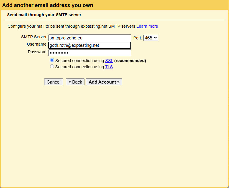 4. In the next window for SMTP Server you'll enter smtppro.zoho.eu. For the Port number to the right, select 465. In the username field enter your complete eXp email address. In the password field enter the application specific password you created for this setup. Verify the secured connection selected is SSL. Review the entered information to ensure all is correct and then click Add Account.