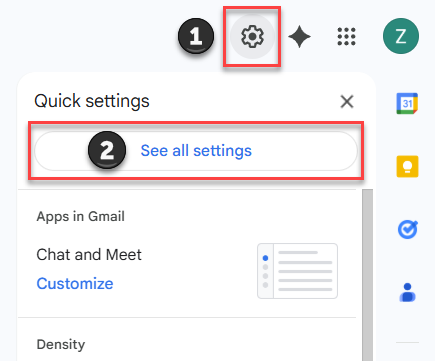 1. Log into your Gmail account and open the main settings menu by clicking the gear