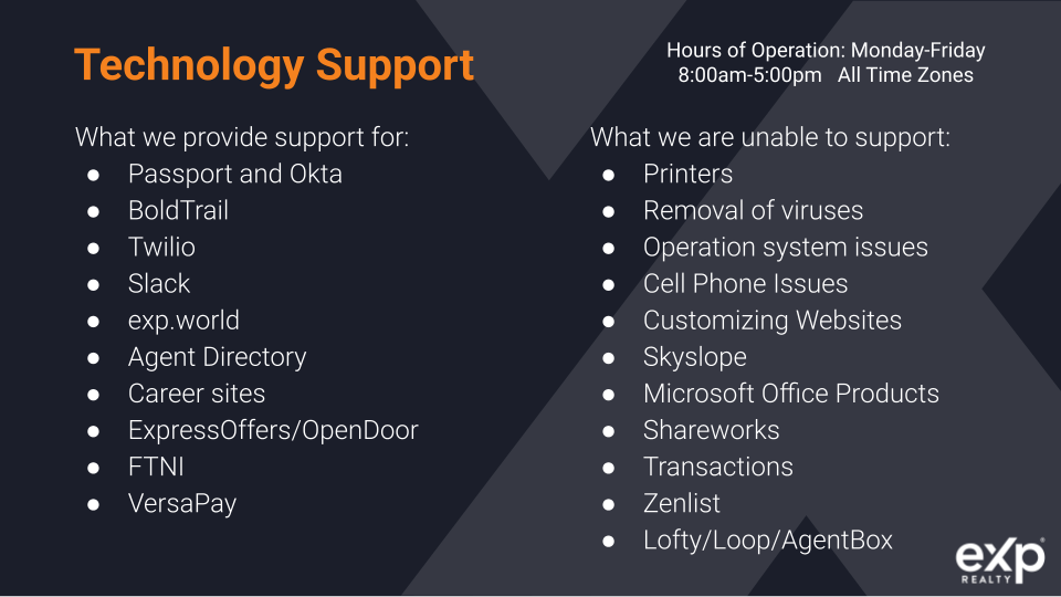 - Visit us in eXp World's Tech Outpost at https://exp.world/techsupport-agent or if you are in World already (Click GO TO > Agent Support > Tech Support Outpost)