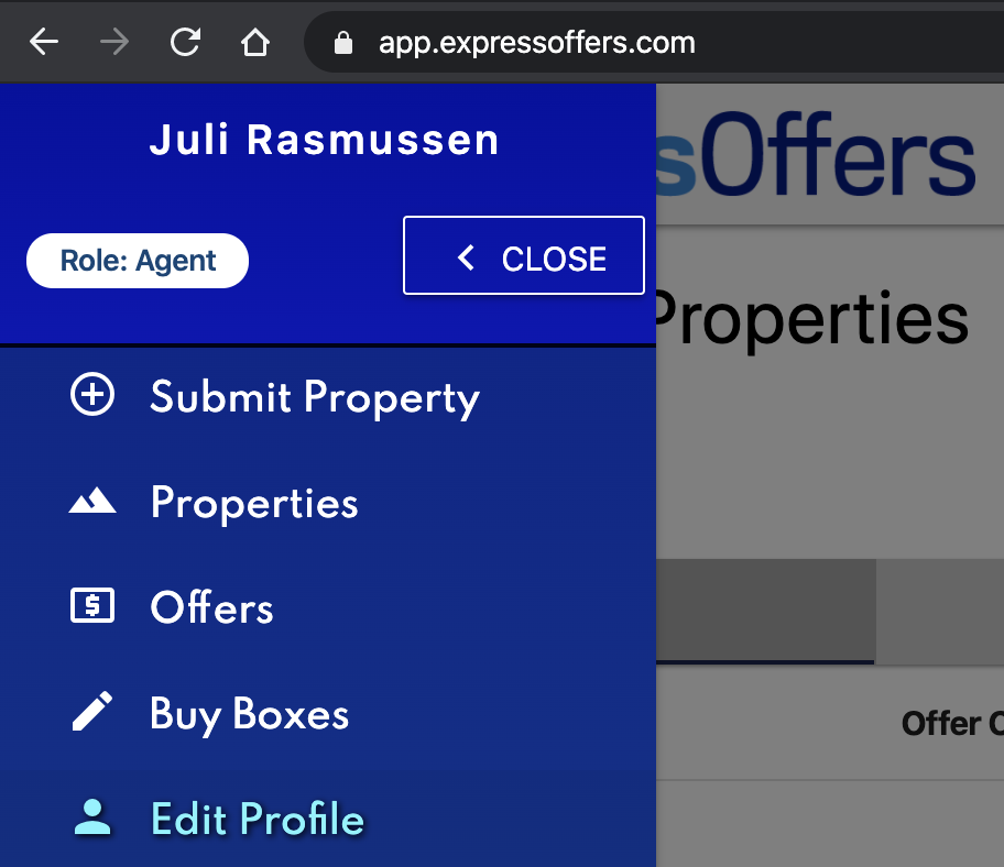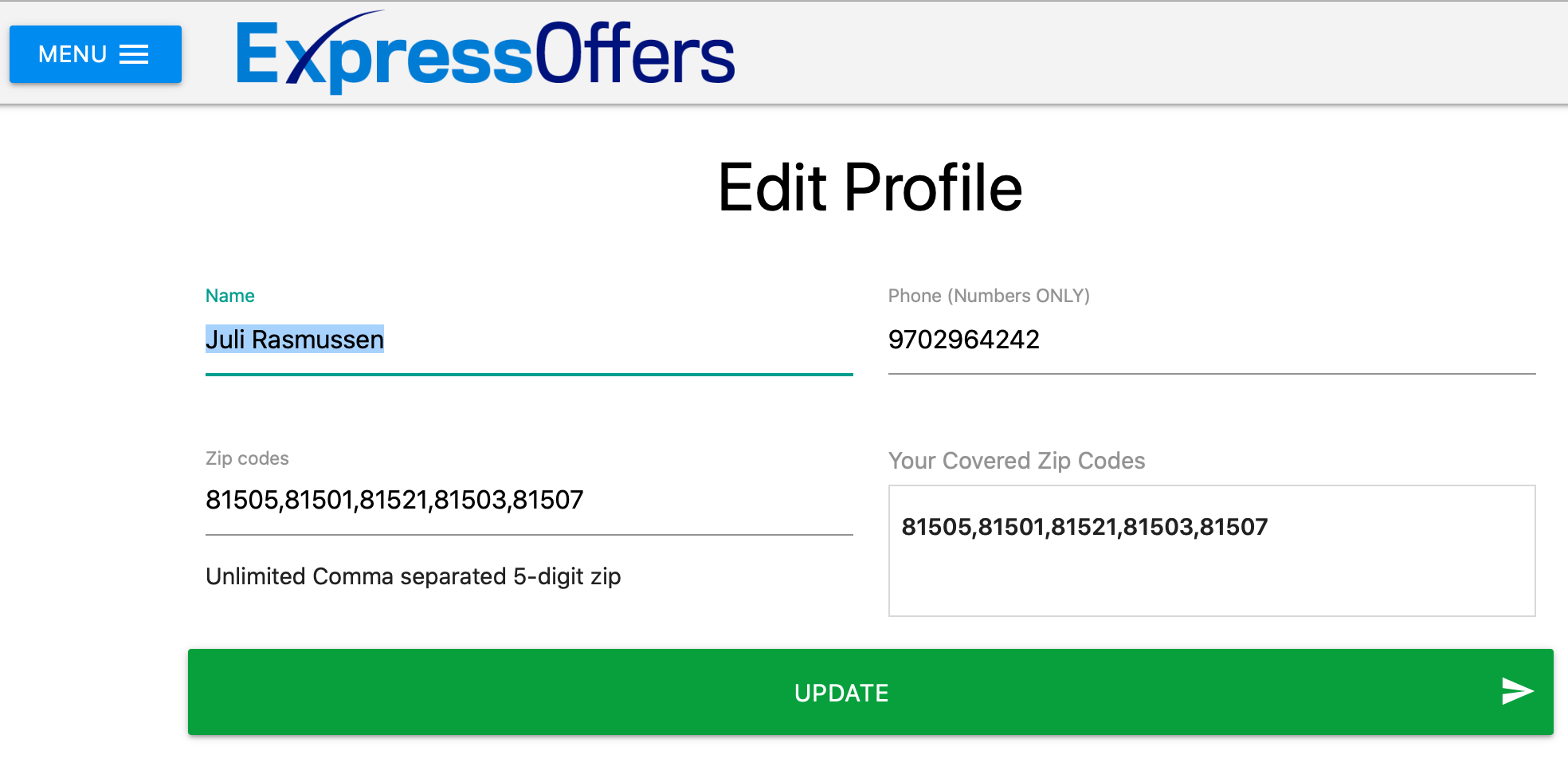 When you first log in to app.expressoffers.com be sure to click on Edit Profile in the blue menu bar on the left and update your phone number (so that iBuyers can contact you, if they want to) and zip codes that you service and then click UPDATE.